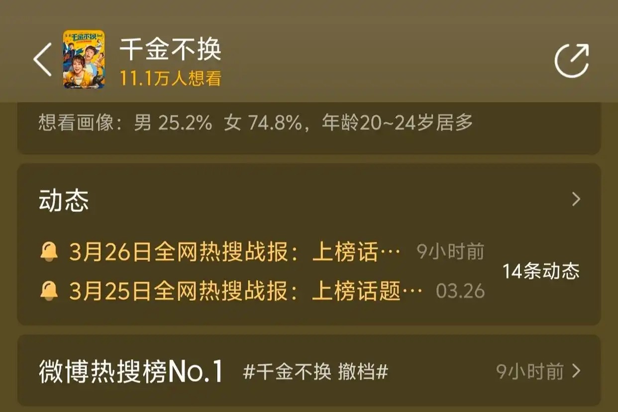 《千金不换》撤档的消息,是3月26号晚上传出来的,起因是有细心的网友意外发现该片官微悄悄编辑了置顶的定档预告。