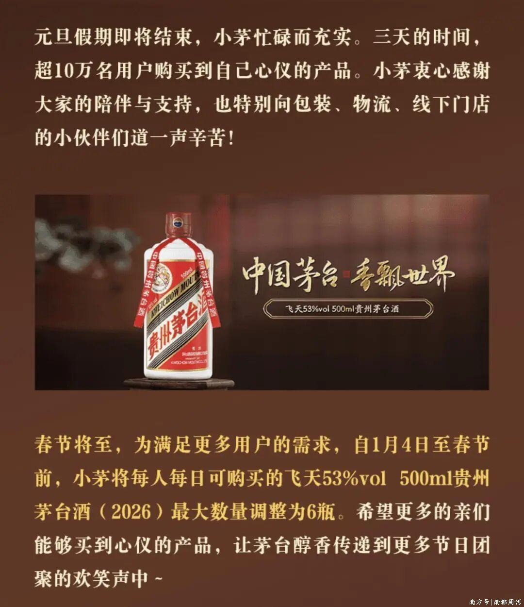 南都湾财社记者还注意到,i茅台方面还披露,2026年1月1日至1月3日,超10万名用户购买到茅台酒。